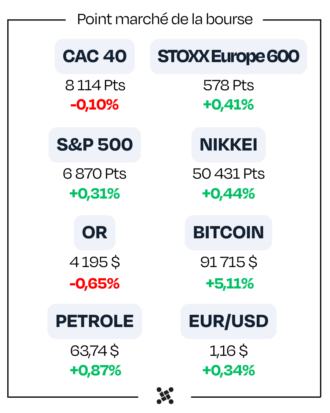 1. Les marchés attendent la décision de la Fed mercredi, avec 87 % de probabilité d’une baisse de taux. Le climat reste flou : emploi en recul, inflation maîtrisée, activité molle et shutdown perturbant les données. Aux États-Unis, les chiffres réels restent solides tandis que les enquêtes montrent un ralentissement. Au Japon, la BoJ évoque une hausse de taux, pouvant provoquer un débouclage du carry trade. En parallèle, les résultats d’Oracle, Adobe et Broadcom seront scrutés dans un contexte IA plus incertain.