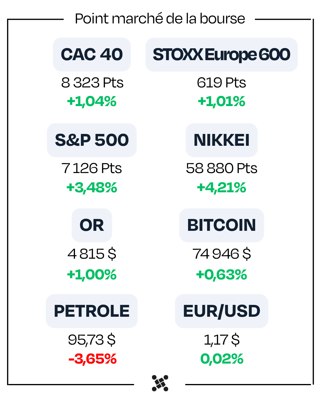 1. 📊 Wall Street a salué la réouverture d'Ormuz par l'Iran vendredi avec un S&P 500 en hausse de 1,2 % et un WTI en chute de 12 %. Mais le week-end a tout défait : Trump a maintenu le blocus naval, Téhéran a refermé le détroit, et le Brent est remonté à 95 USD lundi. Le schéma rappelle avril 2025 et les tarifs douaniers : le marché price le retrait d'une menace, pas sa résolution.