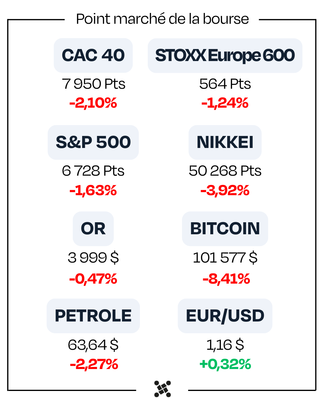 1. Après plusieurs semaines d’euphorie, les marchés marquent une pause : le Nasdaq 100 recule de 3 %, les valorisations tech inquiètent, et la Fed reste prudente face à l’inflation. Le VIX remonte légèrement, signe d’une consolidation plus que d’une panique. Aux États-Unis, le shutdown perturbe les données économiques, compliquant les décisions de la Fed. Pendant ce temps, Michael Burry parie à la baisse sur NVIDIA et Palantir, ravivant les craintes d’une bulle autour de l’intelligence artificielle.