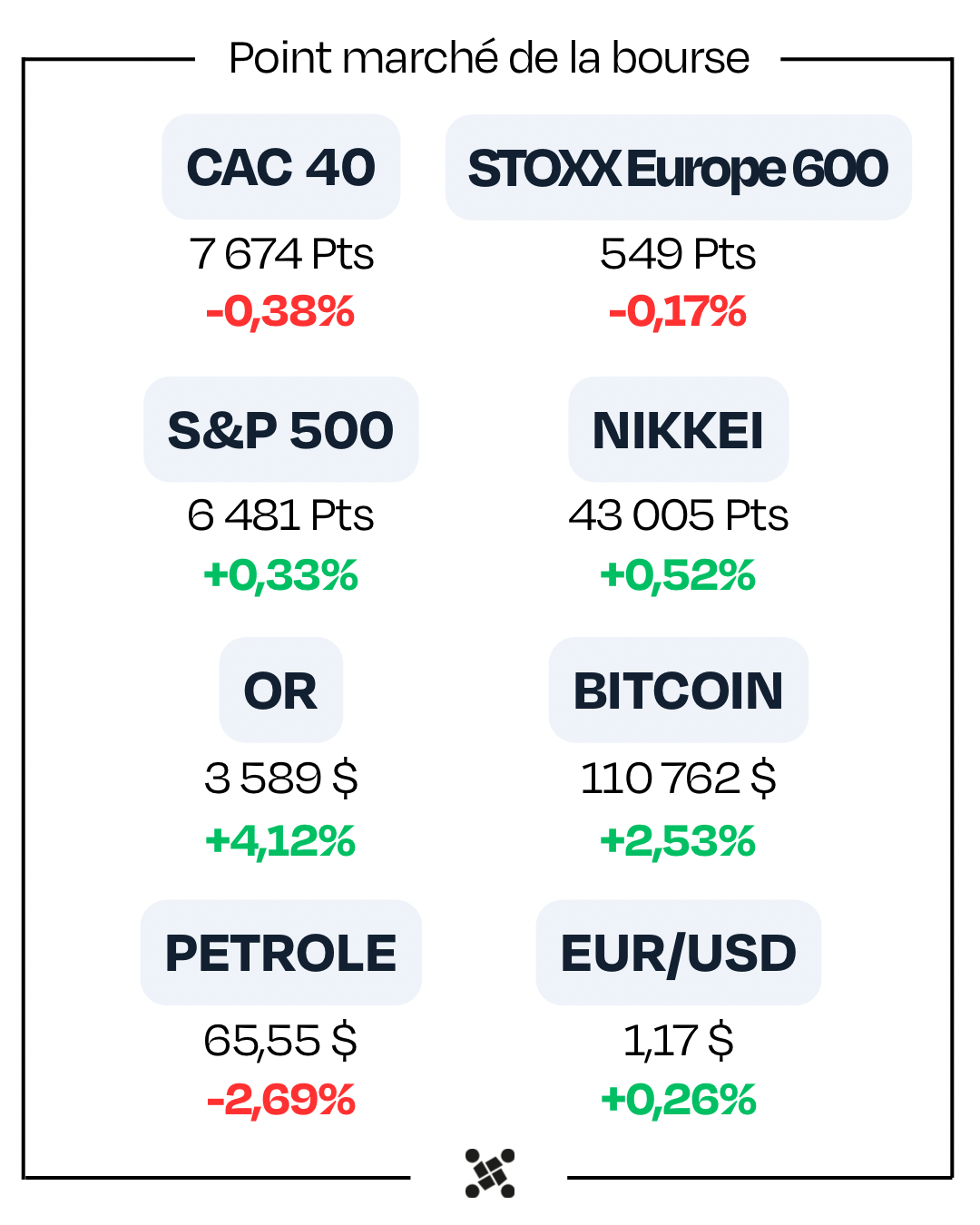 1. En août, l’économie américaine n’a créé que 22 000 emplois contre 73 000 attendus, confirmant le ralentissement du marché du travail. Les investisseurs anticipent désormais trois baisses de taux de la Fed d’ici fin 2025, malgré une inflation PCE core encore à 2,9 %. Ce contexte ravive le spectre de la stagflation. Avec une allocation record en actions (55 %), le marché se trouve à un tournant : bulle spéculative ou correction. En Europe, la BCE reste en statu quo.