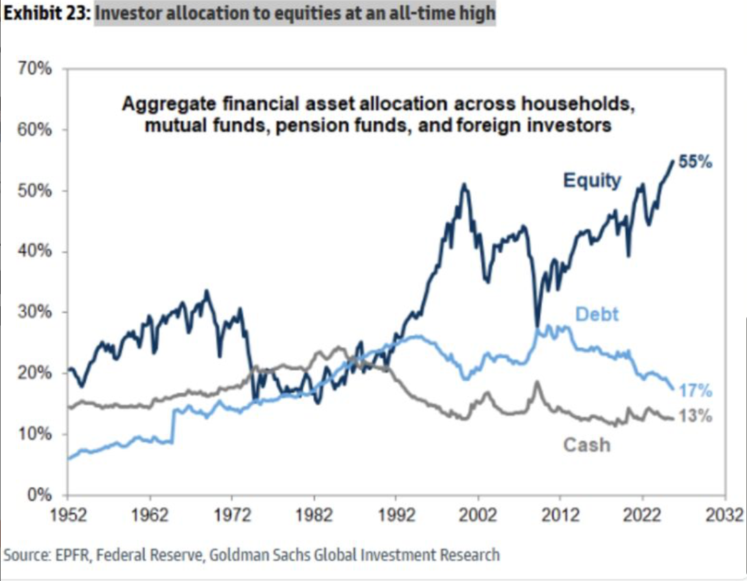 Dans le même temps, la part des actions dans l’allocation financière des investisseurs américains atteint désormais 55 %, un sommet historique.
